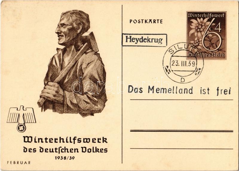Winterhilfswerk (WHW) des deutschen Volkes 1938-39 Februar / "Winter Relief of the German People" NSDAP Nazi Party propaganda, swastika; 6+4 Ga. + "1939 Das Memelland ist frei"