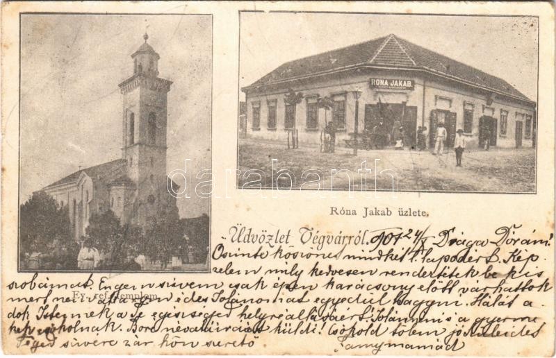Beschreibung: 1901 Végvár, Tormac; református templom, Róna Jakab üzlete / Calvinist church, shop (fl)