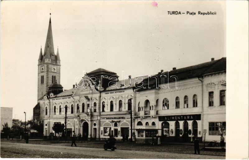 Beschreibung: Torda, Turda; Piata Republicii, Alimentara / square, shops, restaurant, town hall / tér, Néptanács, üzlet, Somegul étterem
