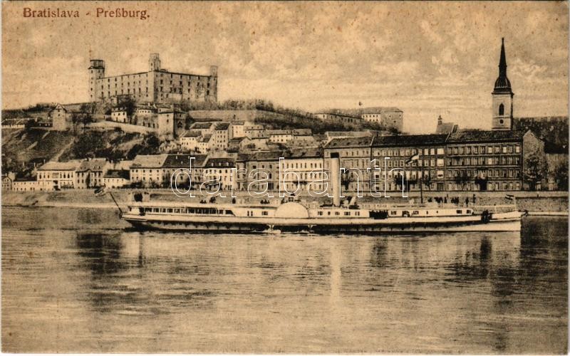 Pozsony, Pressburg, Bratislava; vár, gőzhajó / castle, steamship https://www.darabanth.com/de/410-Fernauktion/410.0/Ansichtskarten/Slowakei~1500007/Pozsony-Pressburg-Bratislava-var-gozhajo-castle-steamship~II2544035