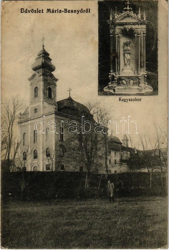 Beschreibung: 1913 Máriabesnyő (Gödöllő), kegytemplom, kegyszobor. Trittner R. felvétele (fl)