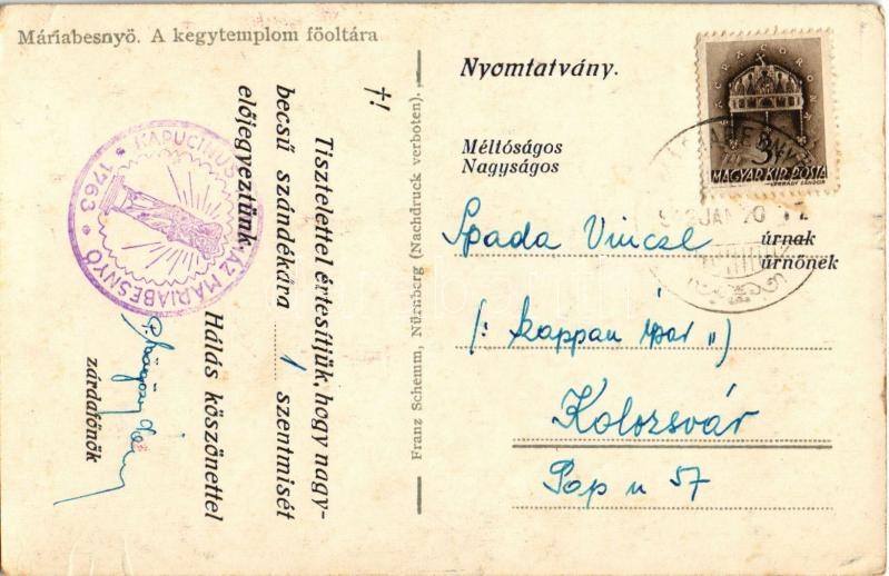 1942 Máriabesnyő (Gödöllő), kegytemplom főoltára (EK) https://www.darabanth.com/de/410-Fernauktion/410.0/Ansichtskarten/Ungarn~1500005/1942-Mariabesnyo-Godollo-kegytemplom-fooltara-EK~II2544144