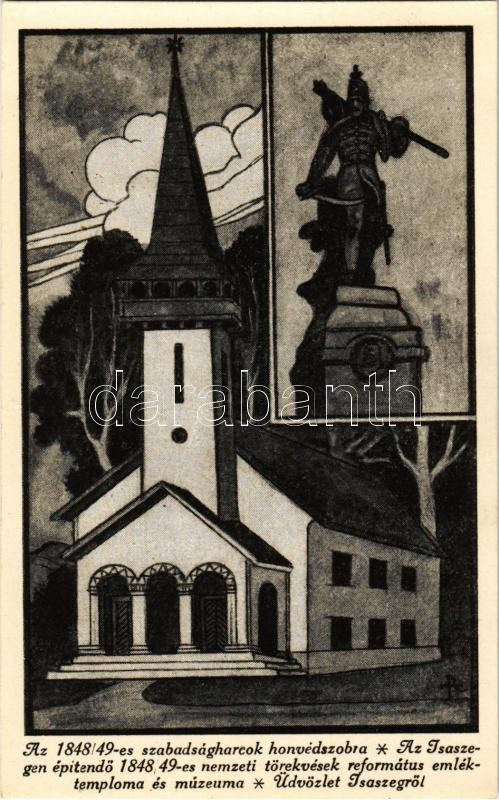 Isaszeg, az 1848-49-es szabadságharcok honvédszobra, emlékmű. Az Isaszegen építendő 1848-49-es nemzeti törekvések református emléktemploma és múzeuma + "1848-1948 Centenáris Verseny Kiállítás 1948. Aug. 20. Isaszeg" So. Stpl.