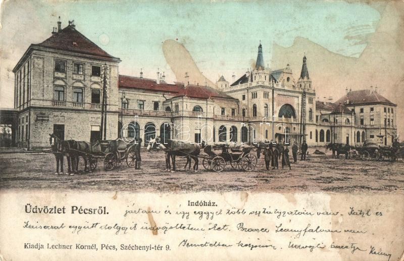Pécs, Indóház, vasútállomás, lovaskocsik. Kiadja Lechner Kornél (fl) https://www.darabanth.com/de/410-Fernauktion/410.0/Ansichtskarten/Ungarn~1500005/Pecs-Indohaz-vasutallomas-lovaskocsik-Kiadja-Lechner-Kornel-fl~II1924484