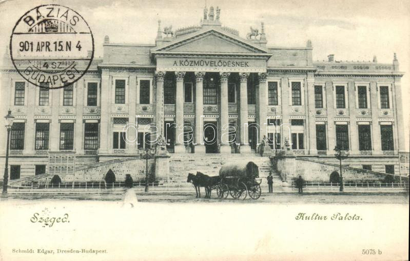 Szeged, Kultúrpalota, lovaskocsi, kiadja Schmidt Edgar; bélyegzéssel a... https://www.darabanth.com/de/410-Fernauktion/410.0/Ansichtskarten/Ungarn~1500005/Szeged-Kulturpalota-lovaskocsi-kiadja-Schmidt-Edgar-belyegzessel-a-kepesoldalon-EK~II1337608