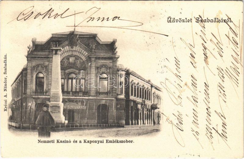 1904 Szabadka, Subotica; Nemzeti kaszinó, Kaponyai emlékszobor, sörcsa... https://www.darabanth.com/de/410-Fernauktion/410.0/Ansichtskarten/Vojvodina~1500010/1904-Szabadka-Subotica-Nemzeti-kaszino-Kaponyai-emlekszobor-sorcsarnok-Krecsi-A-Nandor-ki~II2464851