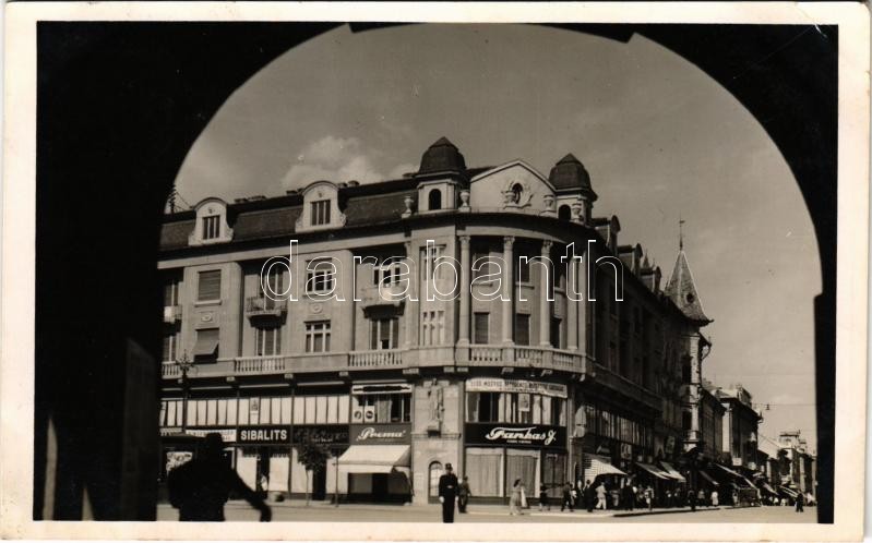 1943 Szabadka, Subotica; Nityin palota, rendőr, Sibalits, Farkas, Steiner üzlete, Első Magyar Általános Biztosító Társaság főügynöksége. Molnár Megyeri István fényképész kiadása / palace, policeman, shops, insurance company (EK)