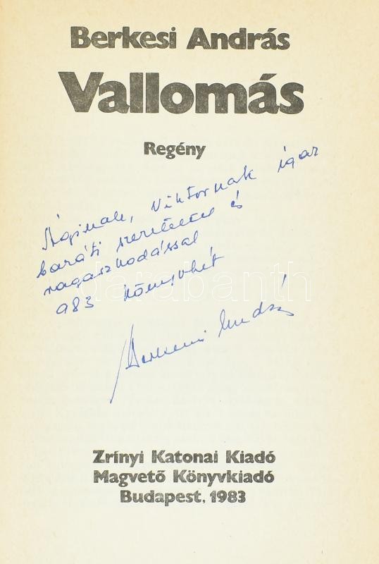 Berkesi András: Vallomás. Bp., 1983, Magvető-Zrínyi Katonai Kiadó. Kiadói egészvászon-kötés, sérült kiadói papír védőborítóban. A szerző által Gábor Viktor részére DEDIKÁLT példány.