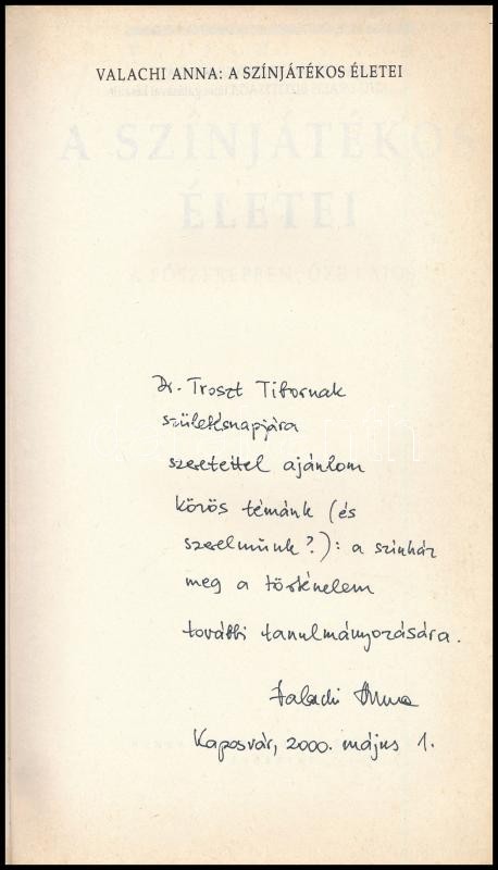 A szerző, Valachi Anna által Troszt Tibor (1947-2007) újságíró, szerkesztő részére dedikált példány.