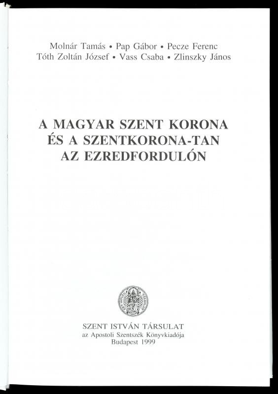 Molnár Tamás et al.: A magyar Szent Korona és a Szentkorona-tan az ezredfordulón. Bp., 1999, Szent István Társulat, 391 p. Kiadói papírkötés, a borítón kisebb ragasztásnyommal, egyébként jó állapotban.