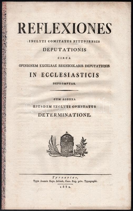 1832 Reflexiones inclyti comitatus Nittriensis deputationis circa opinionem exelsae regnicolaris deputationis in ecclesiasticis depromptae. Cum adnexae ejusdem inclyti comitatus derminatione. Tyrnaviae [Nagyszombat], 1832., Typ. Joannis Bapt. Jelinek, 6 p. Latin nyelven. Papírkötésben, kissé foltos.