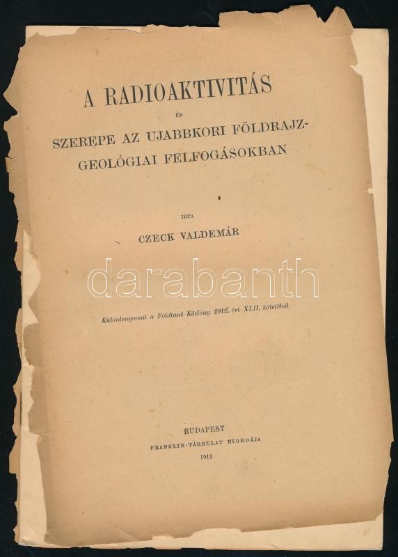 2 db füzet: Czeck Valdemár: A radioaktivitás és szerepe az ujabbkori földrajz-geológiai felfogásokban. Különlenyomat a Földtani Közlöny 1912. évi XLII. kötetéből. Bp., 1912, Franklin-Társulat, 29 p. Kiadói tűzött papírkötés, sérült, szétvált borítóval. + Dr. telegdi Roth Károly: A kincstári ásványolaj- és földigáz-kutatás és termelés 1935-től, a mai állapot és a jövő kilátások. Különlenyomat a "Bányászati és Kohászati Lapok" 1939. évi május hó 1., 9. számából. Bp., (1939), Pallas, 11 p. Kiadói tűzött papírkötés, sérült borítóval, az elülső borító levált.