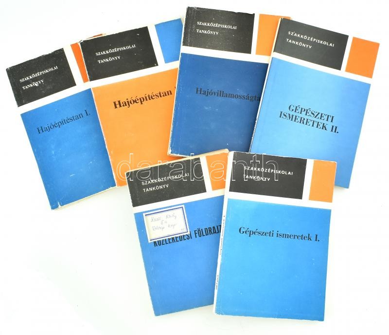 Hajózási szakközépiskolák számára kiadott hajós tankönyvek, 6 db: Hajóépítéstan I-II., Hajóvillamosságtan, Gépészeti ismeretek I-II. köt., Közlekedési földrajz II. Bp., 1981-1984., Műszaki. Kiadói papírkötések, változó állapotban, nagyrészt rossz, vagy széteső állapotú könyvek, jegyzetekkel.