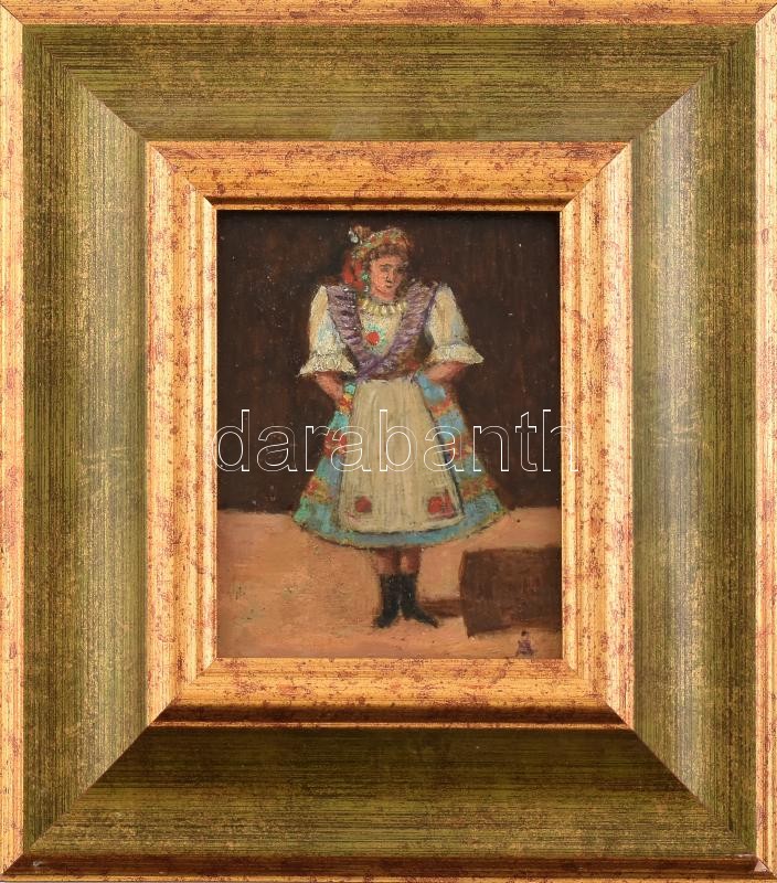 Beschreibung: A (?) jelzéssel: Népviseletes hölgy. Olaj, fa. Dekoratív fa keretben. 14,5x11,5 cm
