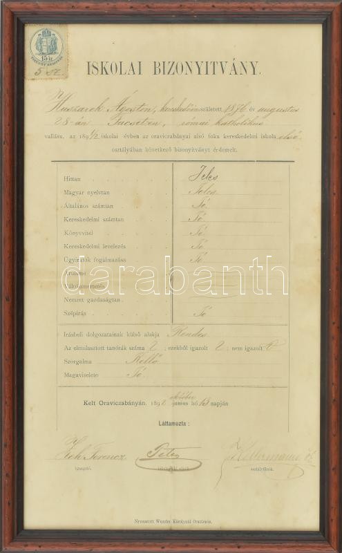 1892 Oraviczabánya, kereskedelmi iskolai bizonyítvány facseti (facsádi) diák részére, 15 krajcár okmánybélyeggel. Hajtásnyomokkal, kisebb szakadással, kissé foltos. Üvegezett fa keretben. 55,5×78 cm