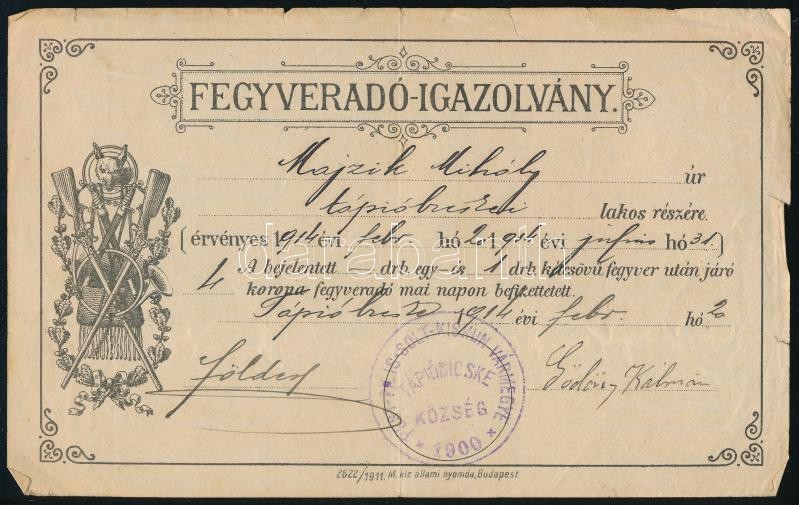 1914 Tápióbecse fegyveradó igazolvány https://www.darabanth.com/de/410-Fernauktion/410.0/Kunst-Dokumente-andere-Sammelgebiete/Dokument~500019/1914-Tapiobecse-fegyverado-igazolvany~II2548663