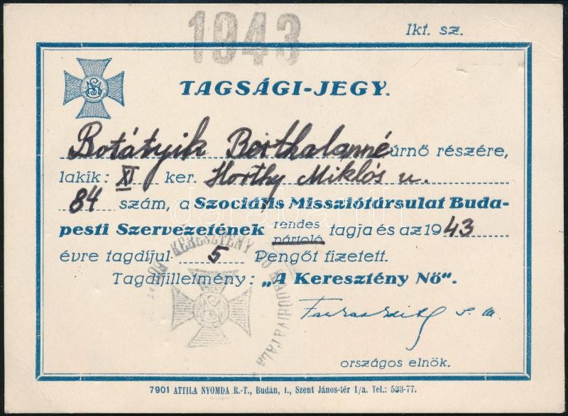 1943 Szociális Missziótársulat Tagsági jegy https://www.darabanth.com/de/410-Fernauktion/410.0/Kunst-Dokumente-andere-Sammelgebiete/Dokument~500019/1943-Szocialis-Missziotarsulat-Tagsagi-jegy~II2129923