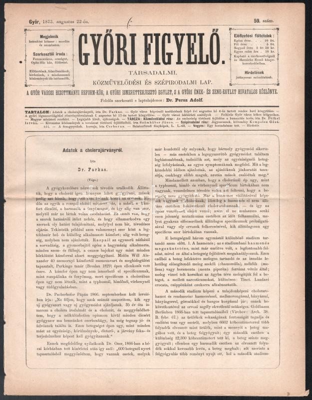 Beschreibung: 1873 Győr, Győri Figyelő Társadalmi, Közművelődési és Szépirodalmi Lap 59. szám, címlapon a kolerajárványról szóló cikkel