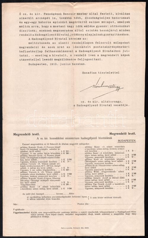 Beschreibung: 1916 A Hadsegélyező Hivatal hazafias és világháborús festményekről készült nyomatok megrendelésére felhívó nyomtatvány és a nyomatok képei