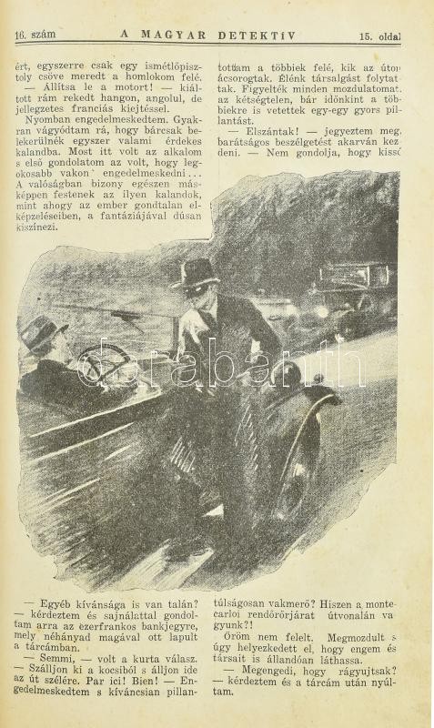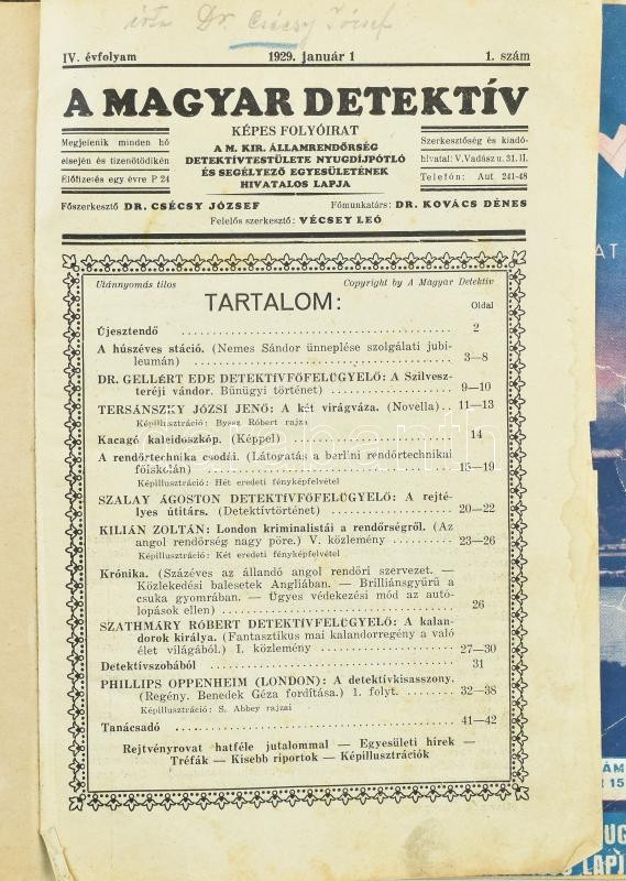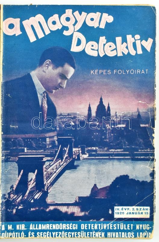 1928-1929 A Magyar Detektív folyóirat több száma egybekötve, fekete-fehér képekkel illusztrálva, kopott, kissé sérült félbőr-kötésben, helyenként sérült, foltos lapokkal