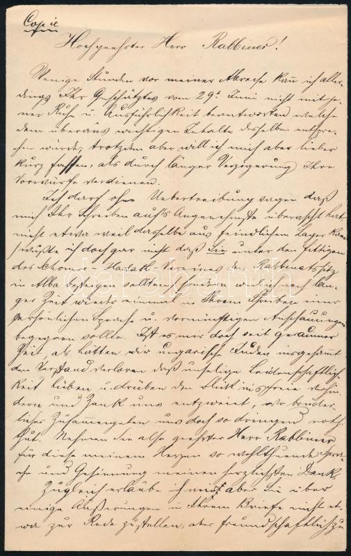 Beschreibung: 1868 Hirschler Ignác (1823-1891) orvos egy pesti rabbinak írt levele három beírt oldal német nyelven