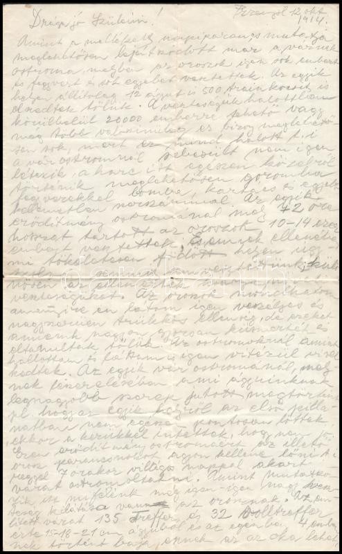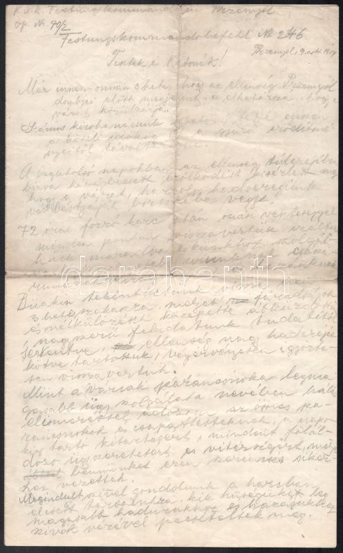 1914 A Przemysl-ben harcoló K. u. k. Festungskommando No. 246 1914. okt- 9-én kiadott vezetői parancsa magyarul, kézzel leírva és beszámoló a harcokról, Deutsch Leó kadét szüleinek elküldött 4 oldalas levele, rendkívül érdekes katonai dokumentum, hajtva de szép állapotban