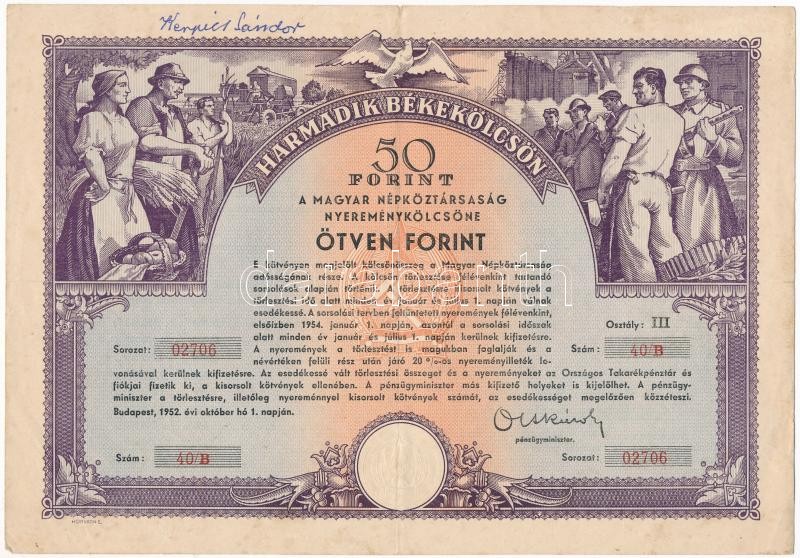 Beschreibung: 1952. "Harmadik Békekölcsön" sorsjegy 50Ft-ról, szárazpecséttel T:III kis beszakadások