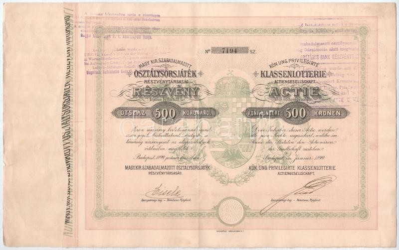 Beschreibung: Budapest 1899. "Magyar Királyi Szabadalmazott Osztálysorsjáték Részvénytársaság" részvénye 500K-ról, felülbélyegzésekkel T:III kis szakadások