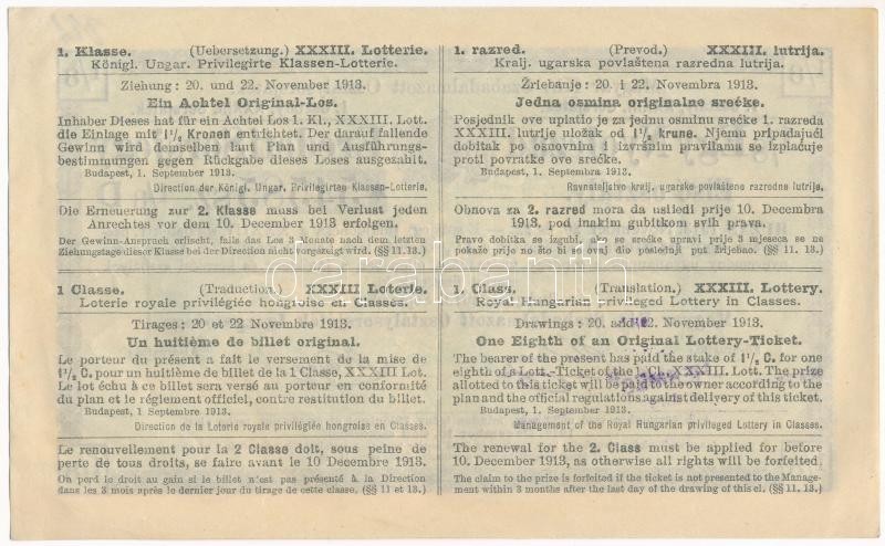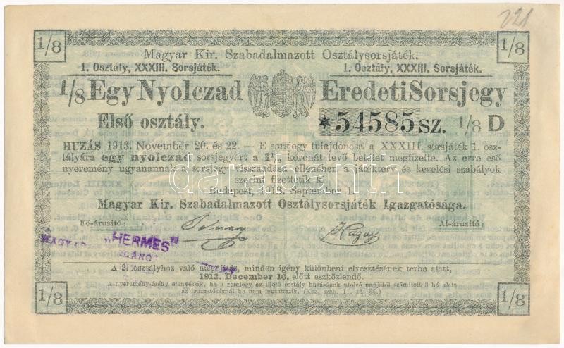 Beschreibung: Budapest 19123. "Magyar Kir. Szabadalmazott Osztálysorsjáték, I. osztály, XXXIII. Sorsjáték" 1/8 sorsjegy felülbélyegzéssel T:I-,II
