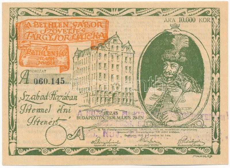 Budapest 1926. "A Bethlen Gábor Szövetség Tárgysorsjátéka" 1... https://www.darabanth.com/de/410-Fernauktion/410.0/Numismatik/Aktien-und-Tickets~2000022/Budapest-1926-A-Bethlen-Gabor-Szovetseg-Targysorsjateka-10000K-arban-belyegzessel-szC3~II2544647