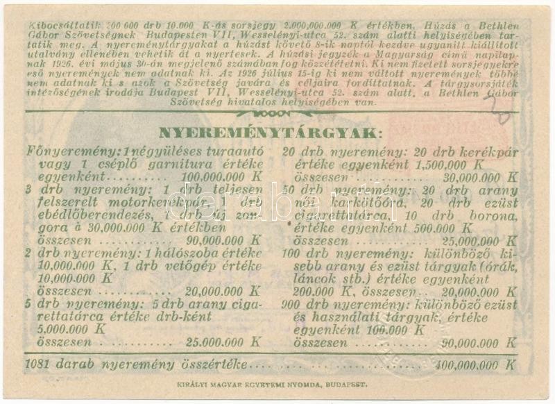 Beschreibung: Budapest 1926. "A Bethlen Gábor Szövetség Tárgysorsjátéka" 10.000K árban, bélyegzéssel, szárazpecséttel T:I-