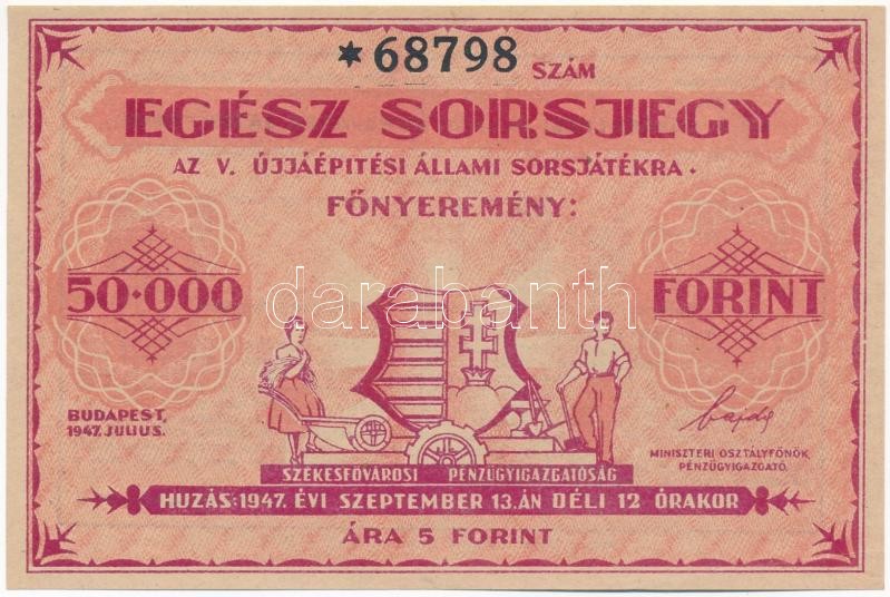 Budapest 1947. "Egész Sorsjegy a V. Újjáépítési Állami Sorsjátékr... https://www.darabanth.com/de/410-Fernauktion/410.0/Numismatik/Aktien-und-Tickets~2000022/Budapest-1947-Egesz-Sorsjegy-a-V-Ujjaepitesi-Allami-Sorsjatekra-sorsjegy-5Ft-arban-TI~II2544603
