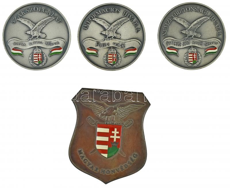 Beschreibung: ~1990. "Nemzetbiztonsági Hivatal - Fallaces sunt rerum species" ezüstpatinázott emlékérem, zománcozott címerrel (60mm) + "Információs Hivatal - Fama volat" ezüstpatinázott emlékérem, zománcozott címerrel (zománchiba) (60mm) + "Szakszolgálat - Fortes fortuna adiuvat" ezüstpatinázott emlékérem, zománcozott címerrel, hátoldalán gravírozással (60mm) + "DN "Magyar Honvédség" pajzs alakú Br plakett műgyantás címerrel (70x83mm) T:1-,2