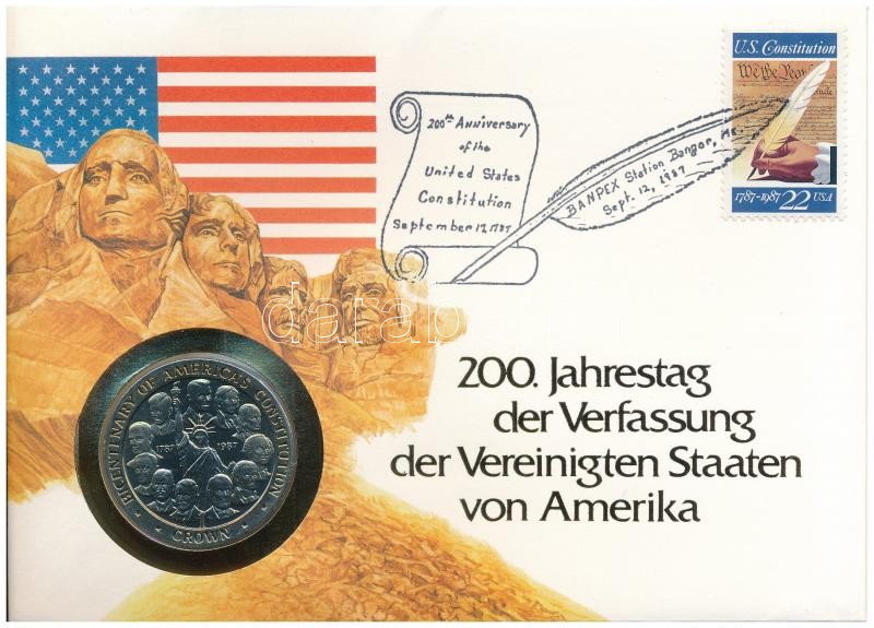 Isle of Man 1987. 1 Crown Cu-Ni "Bicentenary of America's Constitution" in envelope with stamp and cancellation, german language description C:UNC
