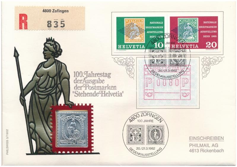 Svájc 1982. "100 éves az álló Helvétia" jelzett Ag bélyegérem, érmés borítékban, bélyeggel és bélyegzéssel (0.999) T:1