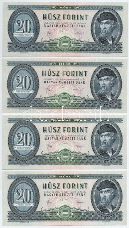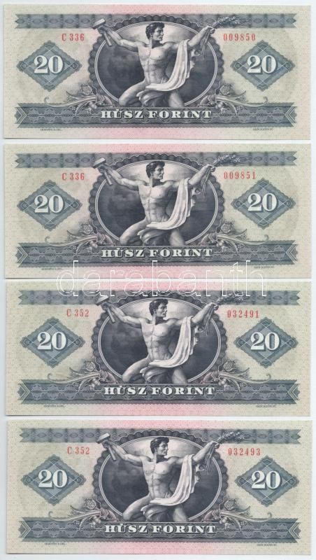 Beschreibung: 1980. 20Ft (2x, sorszámkövetők "C 336 009850 - C 336 009851") + 1980. 20Ft (2x, egyugrásos sorszámkövetők "C 352 032491, C 352 032493") T:II,I Adamo F17
