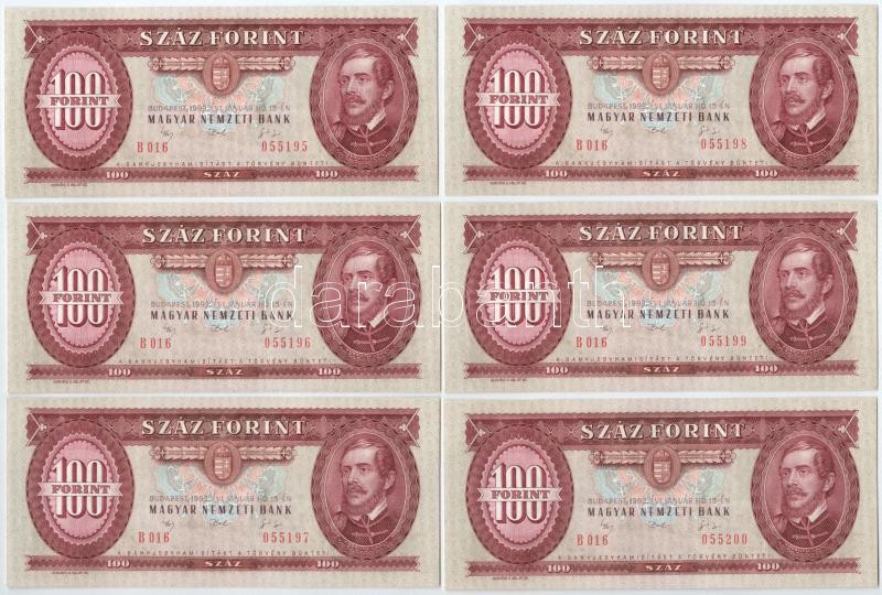 Beschreibung: 1992. 100Ft (6x, sorszámkövetők "B 016 055195 - B 016 055200") T:I Adamo F37