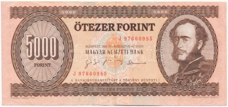 1995. 5000Ft "J" T:III Adamo F52 https://www.darabanth.com/de/410-Fernauktion/410.0/Numismatik/Ungarische-Banknoten~2000007/1995-5000Ft-J-TIII-Adamo-F52~II2543993