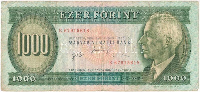 1996. 1000Ft "E 67915618" T:III,III- Adamo F48 https://www.darabanth.com/de/410-Fernauktion/410.0/Numismatik/Ungarische-Banknoten~2000007/1996-1000Ft-E-67915618-TIII-III-Adamo-F48~II2545727