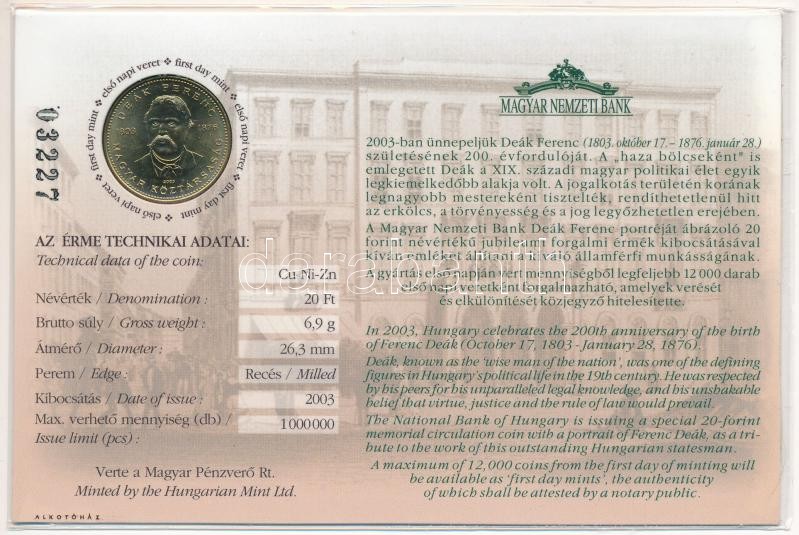 2003. 20Ft "Deák Ferenc" elsőnapi veret, számozott "032... https://www.darabanth.com/de/410-Fernauktion/410.0/Numismatik/Ungarische-Munzen-und-Munzen-mit-ungarischem-Munzzeichen~2000008/2003-20Ft-Deak-Ferenc-elsonapi-veret-szamozott-03227-emleklapon-T1~II2546684