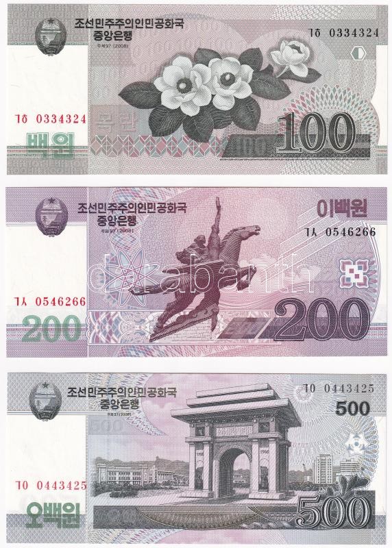 North Korea 2008... https://www.darabanth.com/de/410-Fernauktion/410.0/Numismatik/Weltweit-Banknoten~2000014/Eszak-Korea-2008-100W-plus-2008-200W-plus-2008-500W-TI-North-Korea-2008-100-Won-plus-2008-200-Won-plus-2~II2524273