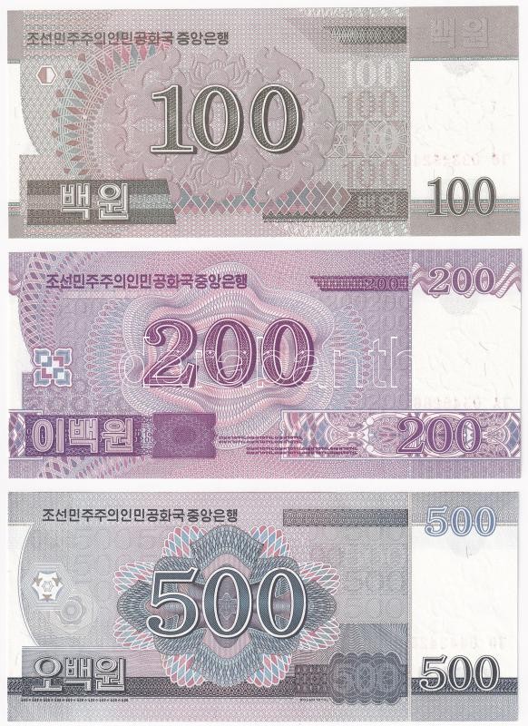 North Korea 2008. 100 Won + 2008. 200 Won + 2008. 500 Won C:UNC