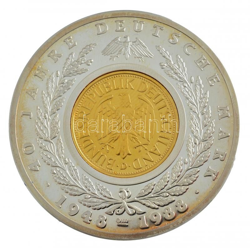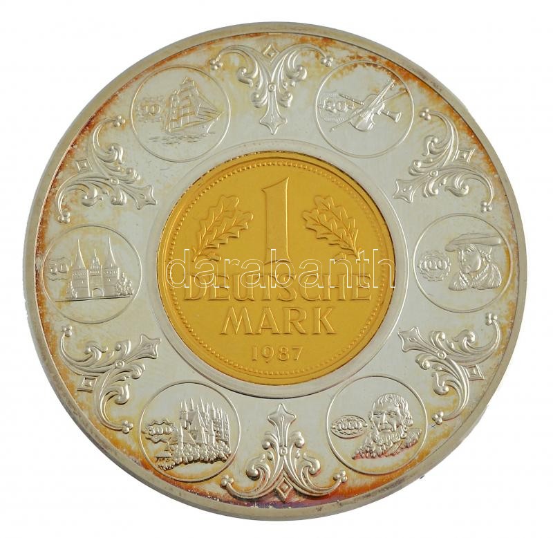 Német Szövetségi Köztársaság 1987D 1M Cu-Ni aranyozva, jelzett Ag keretben, tanúsítvánnyal, dísztokban (1M súlya nélkül ~38,86g/0.999/50mm) T:1-, keret eredetileg PP fo., ujjlenyomat Federal Republic Germany 1987D 1 Mark Cu-Ni gilt in hallmarked Ag frame with certificate in original display case (deducting the coins weight: ~38,86g/0.999/50mm) C:AU, frame originally PP spotted, fingerprint