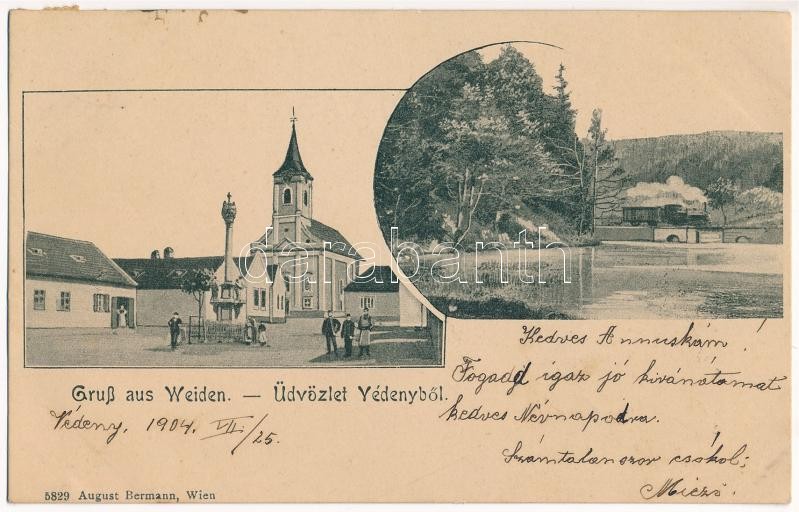 1904 Védeny, Weiden am See; templom, Szentháromság szobor és tér, gőzmozdony. August Bermann / Kirche, Dreifaltigkeitsstatue und Platz, Lokomotive / church, statue and square, locomotive (fl)
