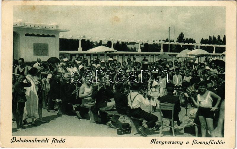 Beschreibung: 1928 Balatonalmádi, Hangverseny a fövenyfürdőn, zenekar (EK)