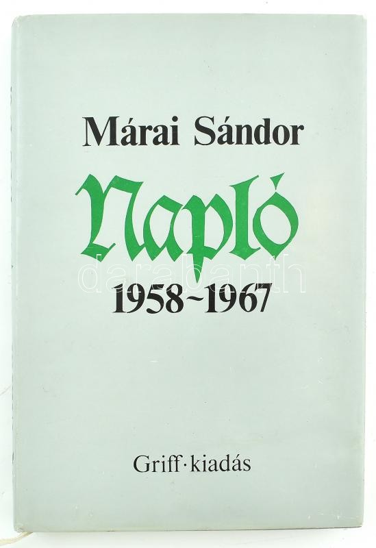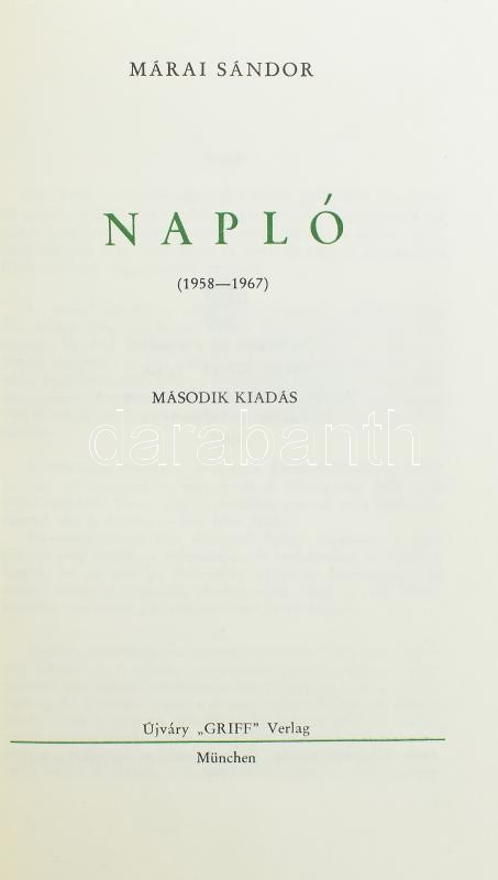 Márai Sándor: Napló 1958-1967. München, Újváry Griff Verlag. Kiadói eg... https://www.darabanth.com/de/411-Fernauktion/411.0/Bucher/Bucher-Andere-kuriositaten~1500021/Marai-Sandor-Naplo-1958-1967-Munchen-Ujvary-Griff-Verlag-Kiadoi-egeszvaszon-kotes-pa~II2555115