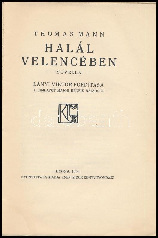 Thomas Mann: Halál Velencében. Novella. Lányi Viktor fordÃtása. A borÃ... https://www.darabanth.com/de/411-Fernauktion/411.0/Bucher/Bucher-Andere-kuriositaten~1500021/Thomas-Mann-Halal-Velenceben-Novella-Lanyi-Viktor-forditasa-A-boritot-Major-Henrik-rajzol~II2555639