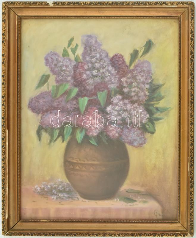 Beschreibung: Olvashatatlan jelzéssel: Orgonák. Olaj, vászon. Üvegezett, sérült fa keretben, 40×30 cm