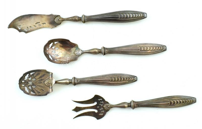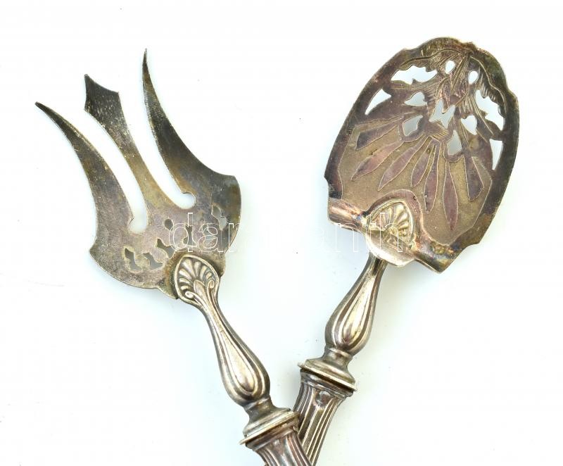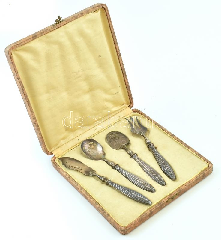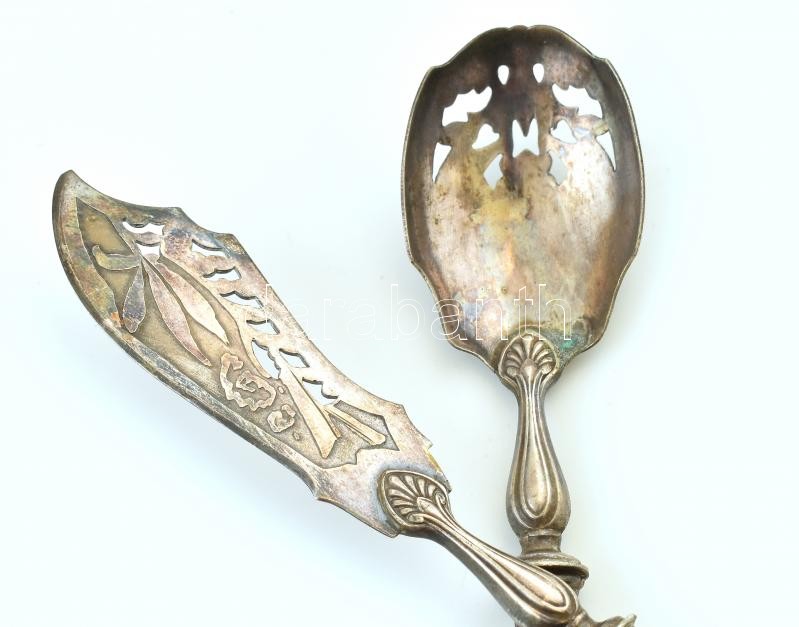 Beschreibung: Ezüst (Ag) nyelű tálalókészlet, jelzett, kopott, díszdobozban, bruttó:135g