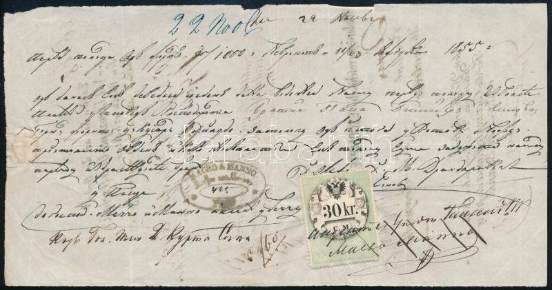 1855 30 kr okmánybélyeg a Macso & Manno (Macsó György - Mannó István) ... https://www.darabanth.com/de/411-Fernauktion/411.0/Kunst-Dokumente-andere-Sammelgebiete/Dokument~505019/1855-30-kr-okmanybelyeg-a-Macso-Manno-Macso-Gyorgy-Manno-Istvan-pesti-szekhelyu-szall~II2555640
